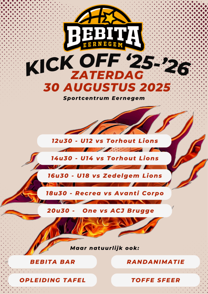 Op zaterdag 30 augustus beginnen we aan het nieuwe basketseizoen met onze Kick Off in de sporthal te Eernegem!